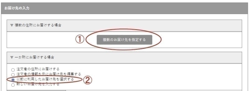 - ①「複数のお届け先を指定する」ボタンを押して下さい。