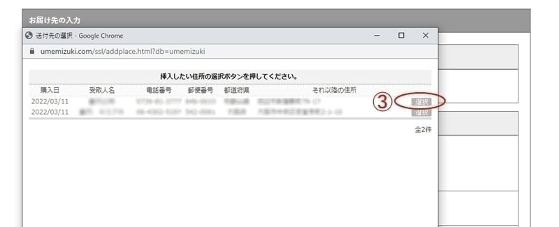 - ②以前に利用した住所へお届けする場合には「以前に利用したお届け先を選択する」を選択して下さい。